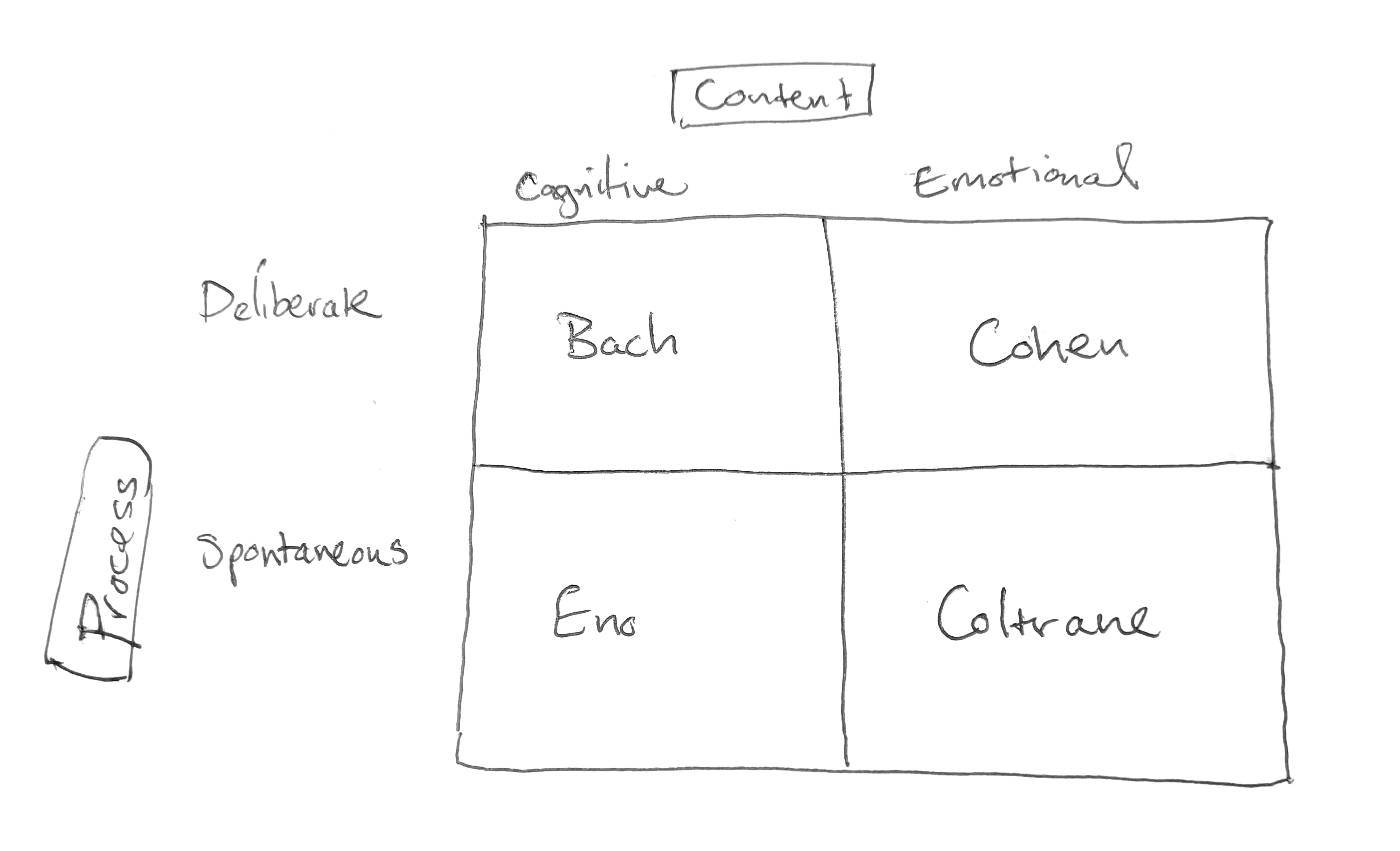 For this one, my mind jumped to Brian Eno and his focus on engineering systems to produce an unexpected outcome. The spontaneous aspect is obvious — he even talks about “not interfering” with his music, except insofar as he chooses which experiments work and which don’t. That’s a huge contrast to Bach and Cohen.